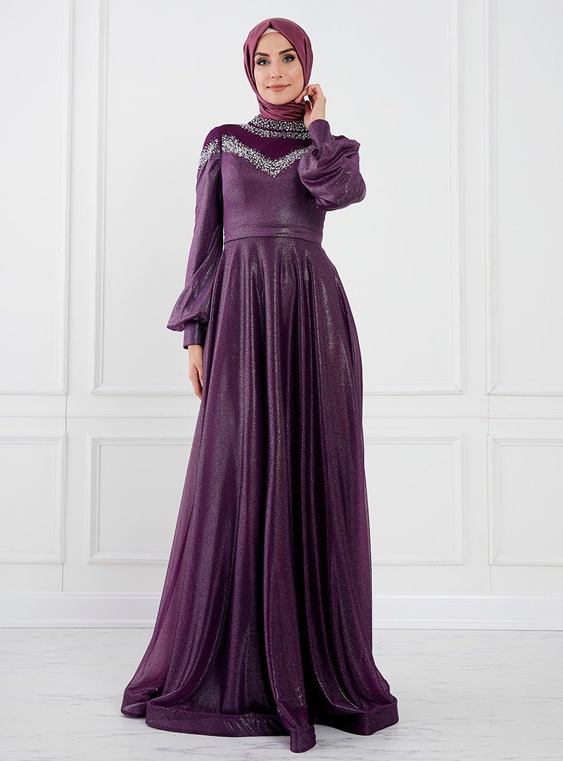 Moda Sinanlar Mürdüm Belinay Abiye Elbise
