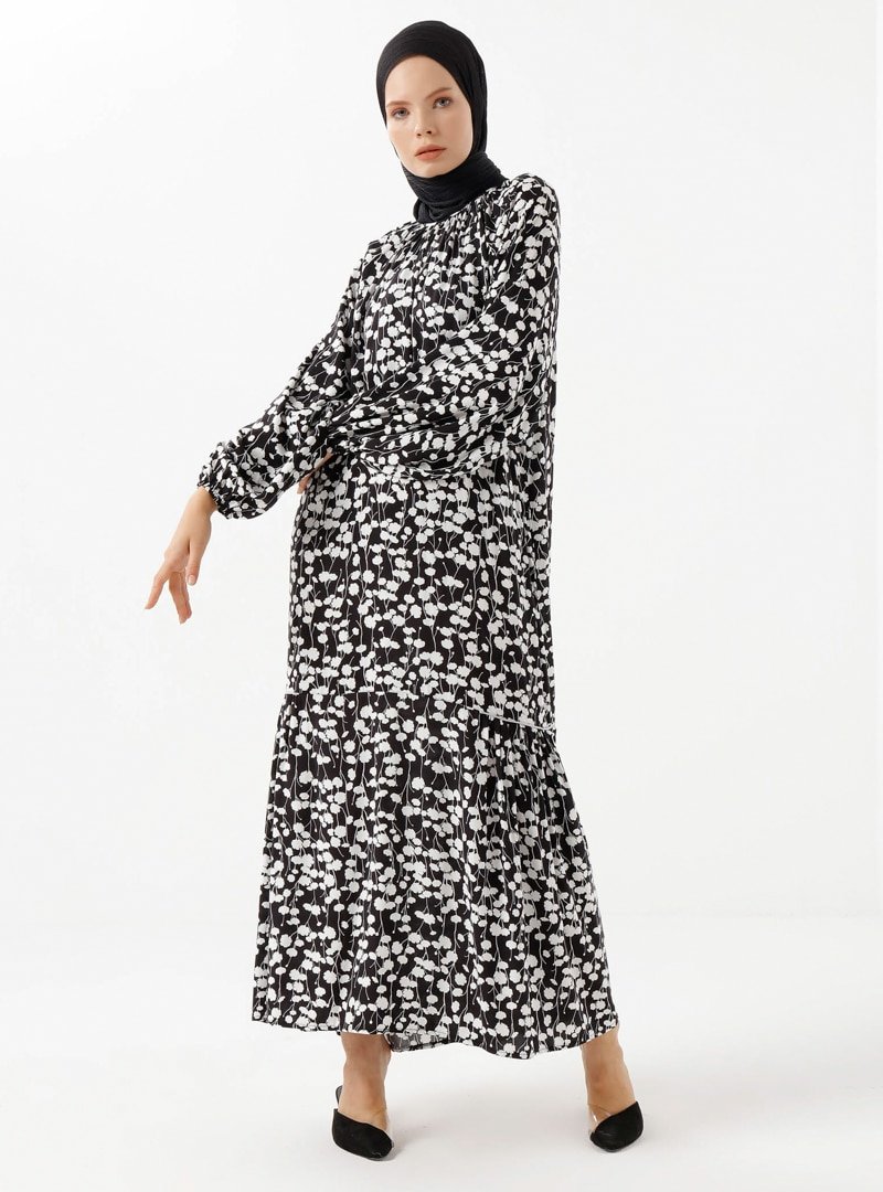 Phull Beyaz Siyah Çiçek Desenli Elbise