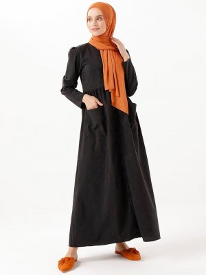 Phull Siyah Doğal Kumaşlı Cepli Elbise