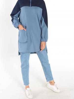 Allday Mavi Garnili Cepli Fermuarlı Sweat Tunik