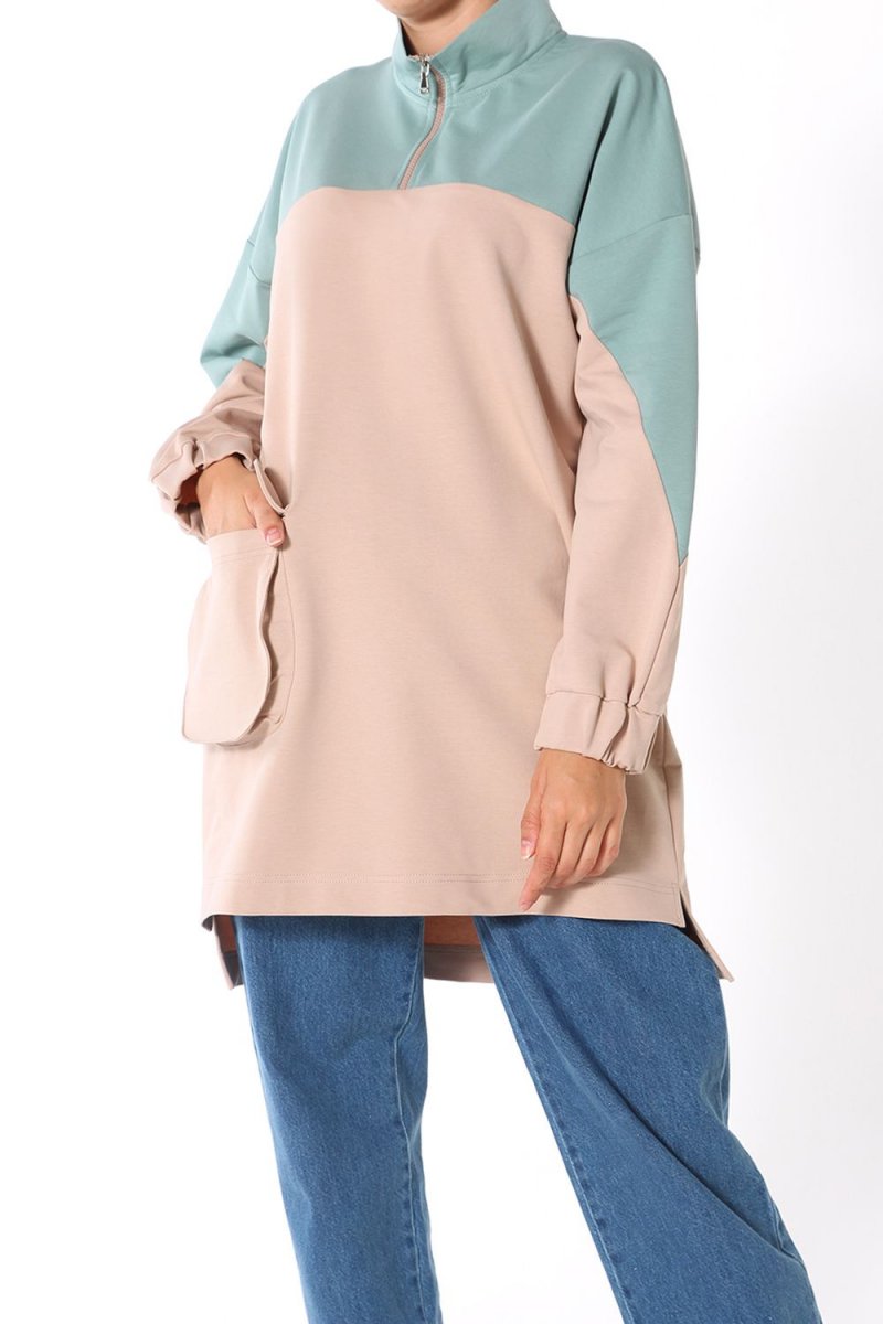 Allday Bej Garnili Cepli Fermuarlı Sweat Tunik