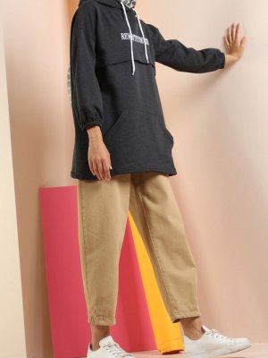 Allday Antrasit Kapüşonlu Nakışlı Cepli Sweatshirt