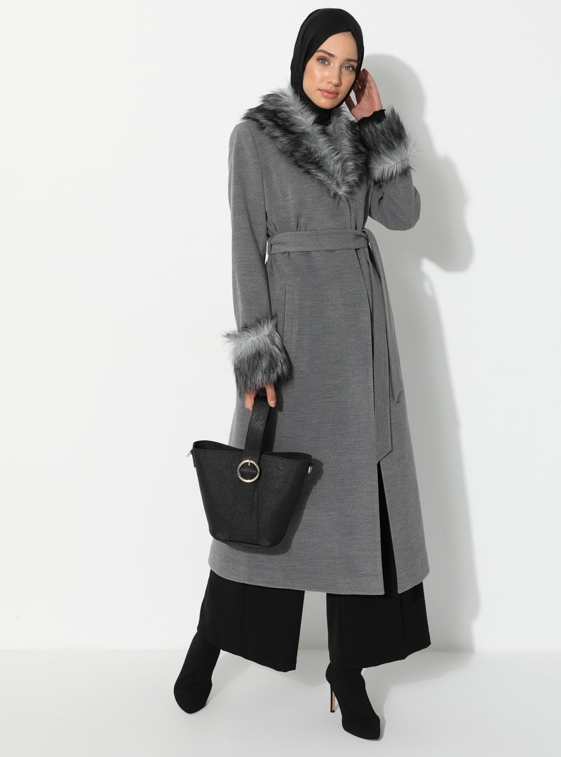 Concept By Olcay Gri Kürk Detaylı Çıtçıt Düğmeli Kaban