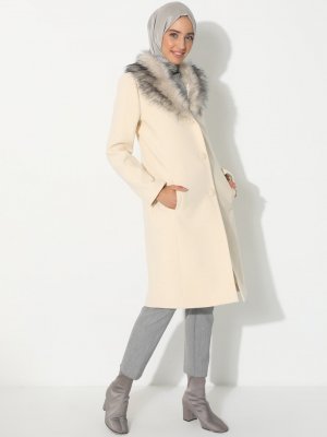 Concept By Olcay Ekru Yakası Kürk Detaylı Kaban