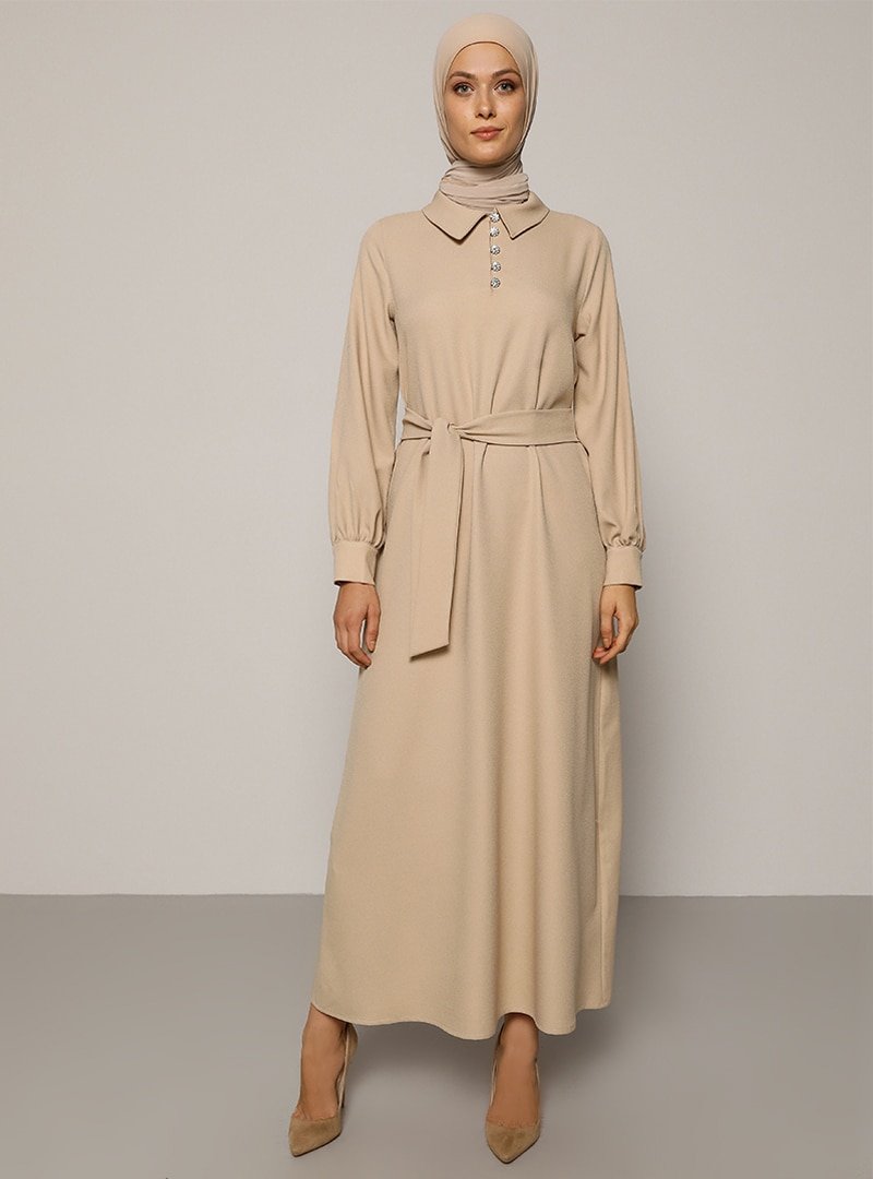 Refka Vizon Açık Düğme Detaylı Kuşaklı Elbise