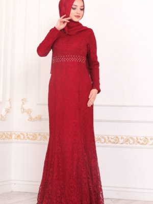 Neva Style Kırmızı Abiye Elbise Dantelli