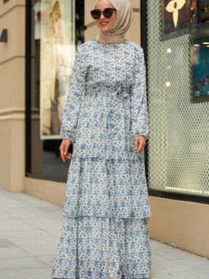 Neva Style İndigo Mavisi Çiçek Desenli Elbise