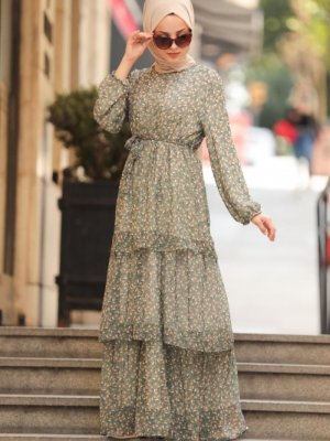 Neva Style Haki Çiçek Desenli Elbise