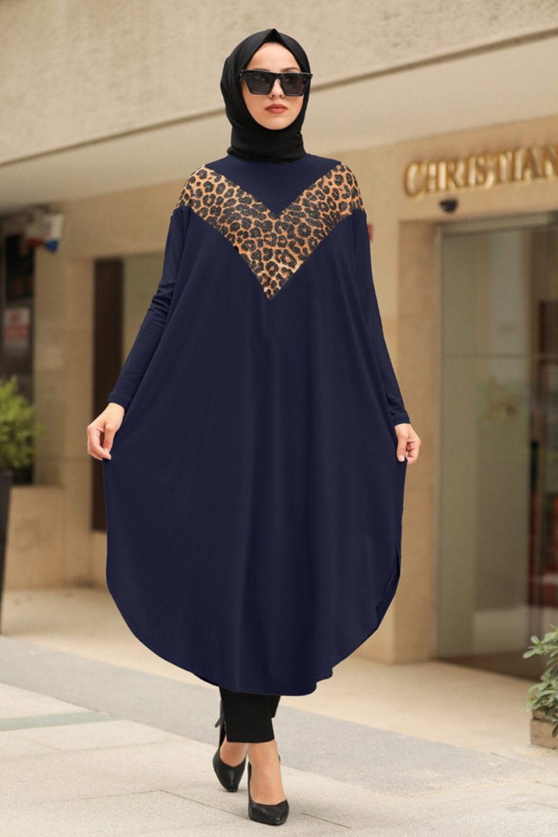 Neva Style Lacivert Leopar Desen Detaylı Tunik
