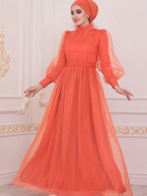 Neva Style Turuncu Yakası Püsküllü Abiye Elbise
