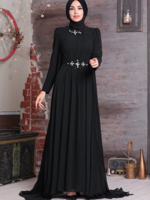 Neva Style Siyah Boncuk Detaylı Abiye Elbise