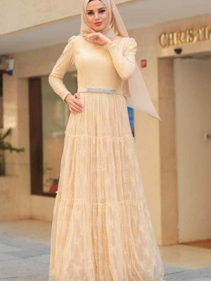 Neva Style Bej Boncuk Detaylı Abiye Elbise