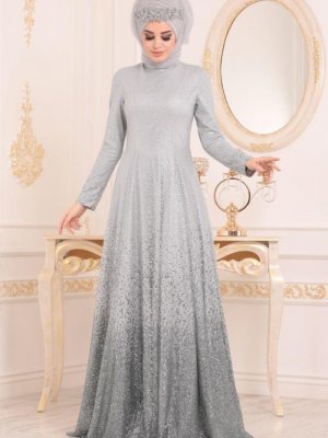 Neva Style Simli Gri Abiye Elbise