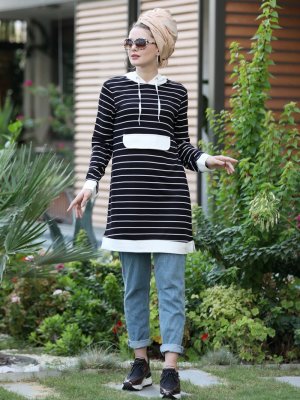 Selma Sarı Design Siyah Çizgili Kapüşonlu Tunik