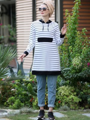 Selma Sarı Design Beyaz Çizgili Kapüşonlu Tunik