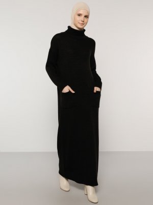 Benin Siyah Cep Detaylı Boğazlı Yaka Triko Elbise