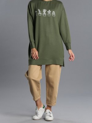 Allday Haki Kaktüs Baskılı Penye Sweat Tunik