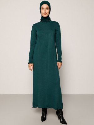 Refka Yeşil Koyu Fırfır Detaylı Balıkçı Yaka Triko Elbise