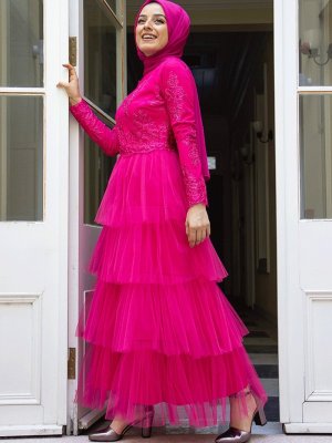 Zehrace Fuşya Kat Tüllü Abiye Elbise