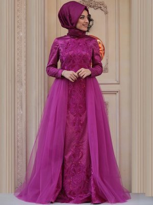 Zehrace Fuşya Tül Detaylı Abiye Elbise