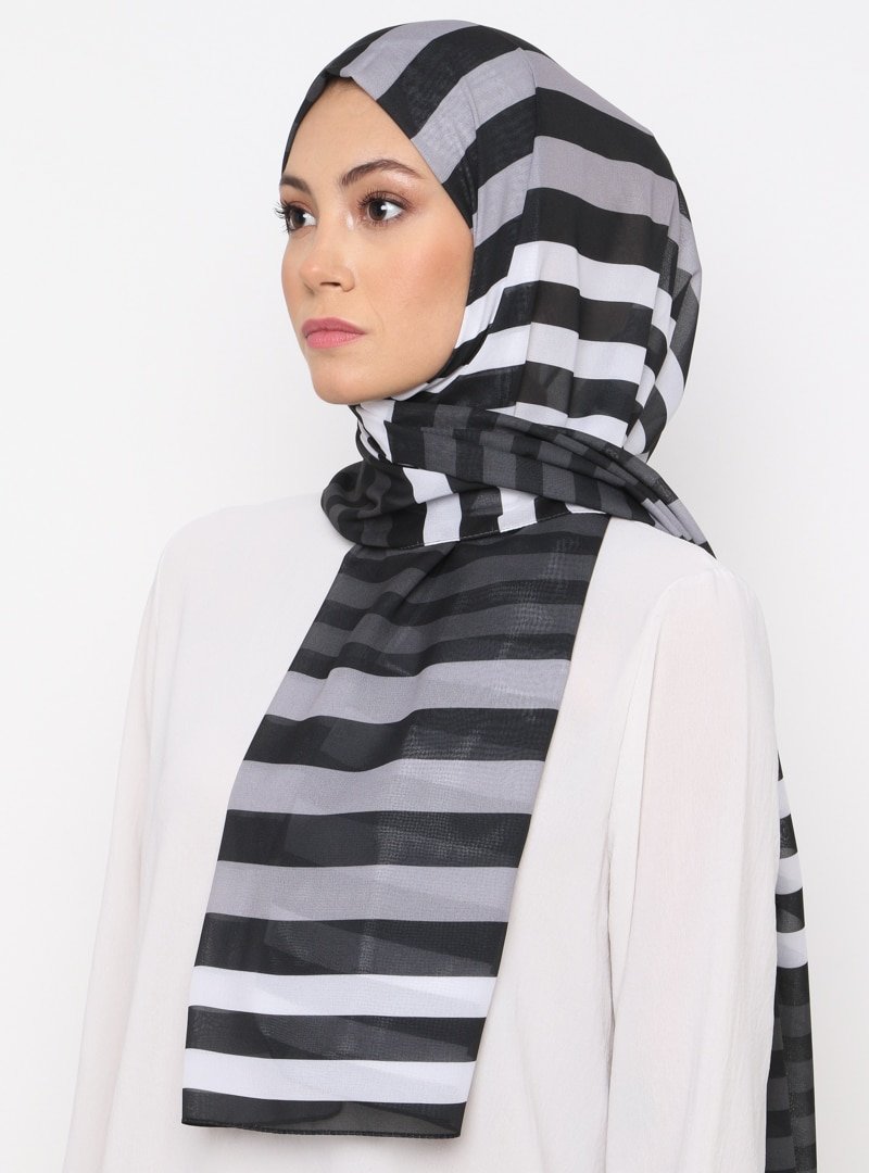 Burden İpek Siyah Çizgili Desen Şifon Şal
