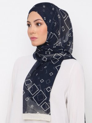 Burden İpek Lacivert Krem Naturel Geometrik Desen Şal