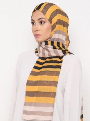 Burden İpek Hardal Çizgili Desen Şifon Şal