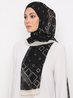 Burden İpek Siyah Krem Naturel Geometrik Desen Şal