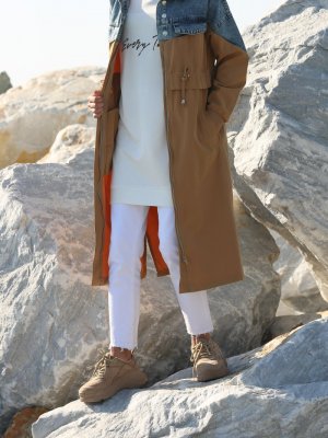Allday Camel Denim Cepli Bağcıklı Düğmeli Trençkot