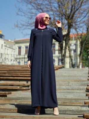 Burcu Tesettür Lacivert Nakış Detaylı Ferace