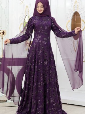 Tesetturhome Mürdüm Çiçekli Abiye Elbise