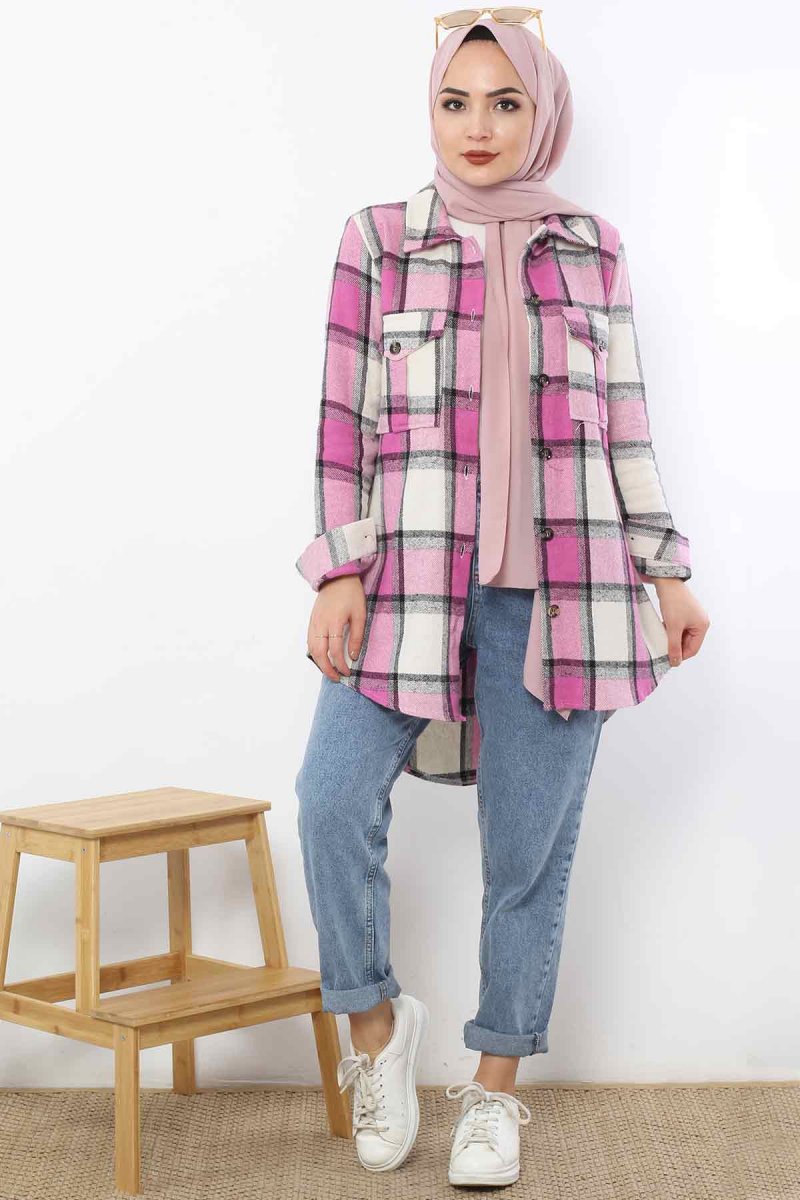 Tesettür Dünyası Pembe Ekose Oduncu Gömlek