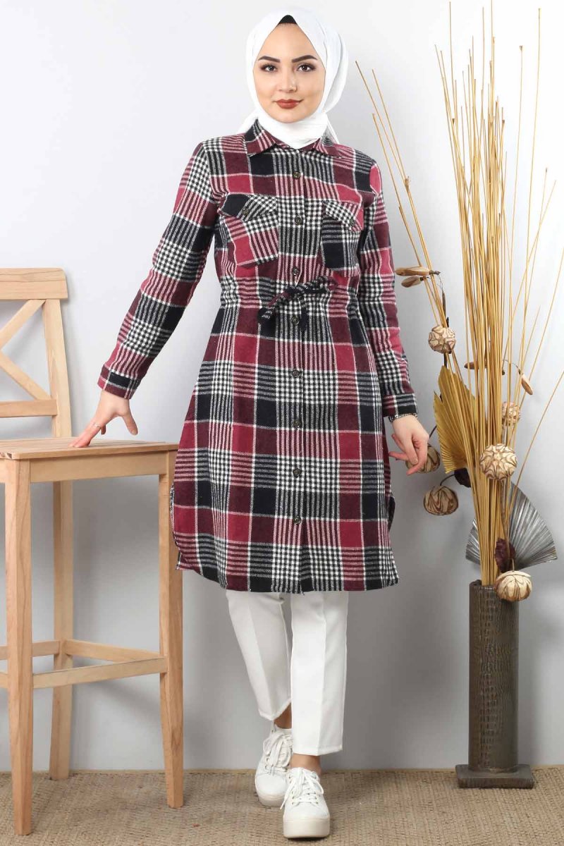 Tesettür Dünyası Bordo Ekose Desen Oduncu Gömlek