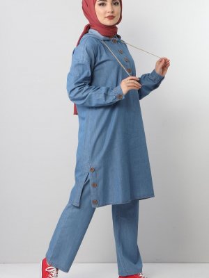 Tesettür Dünyası Açık Mavi Yandan Yırtmaçlı İkili Kot Takım