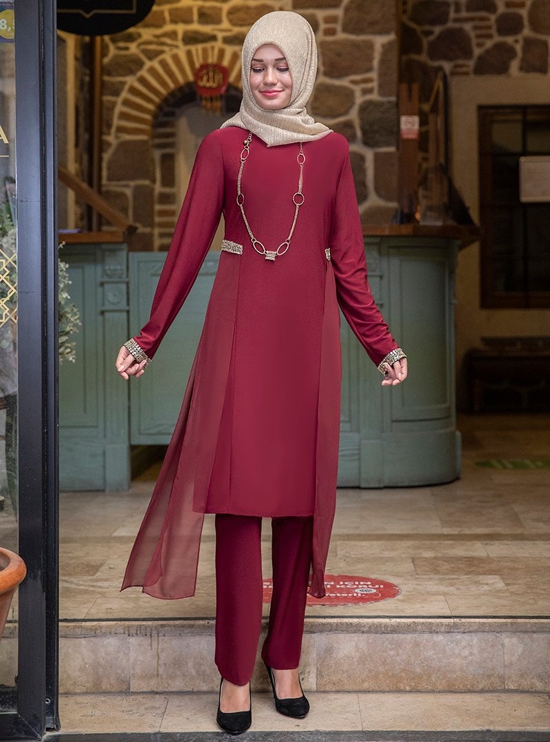 Sure Bordo Hayal Tunik&Pantolon İkili Abiye Takım