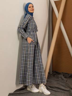 Phull Lacivert Gri Kare Desenli Elbise