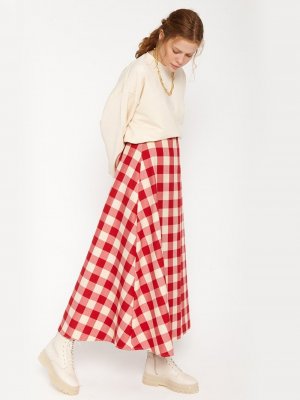 Ceylan Otantik Kırmızı Krem Kare Desenli Kloş Etek