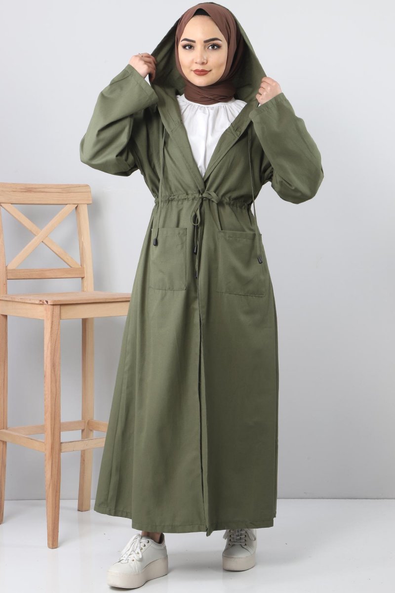 Tesettür Dünyası Haki Kapüşonlu Uzun Kap