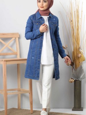 Tesettür Dünyası Mavi Cep Detaylı Kot Ceket