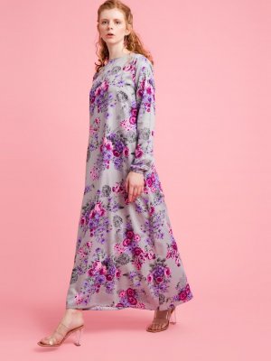 Ceylan Otantik Gri Çiçek Desenli Elbise