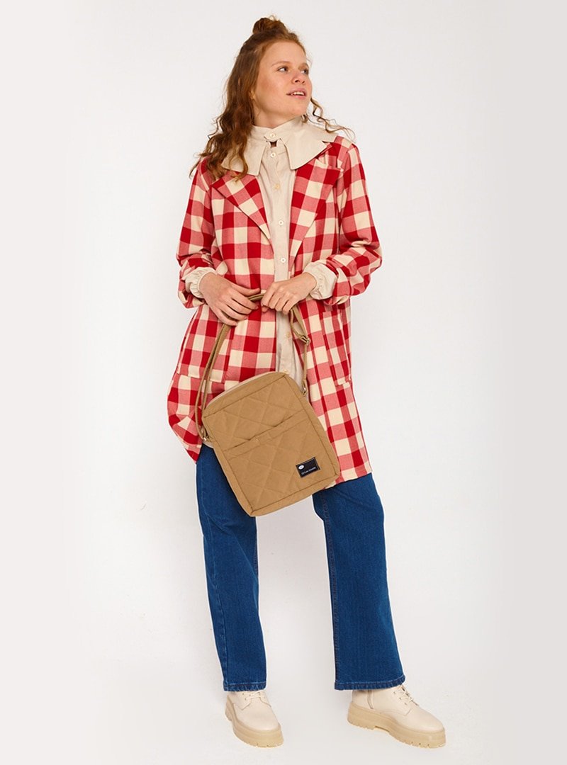 Ceylan Otantik Krem Kırmızı Kare Desenli Ceket