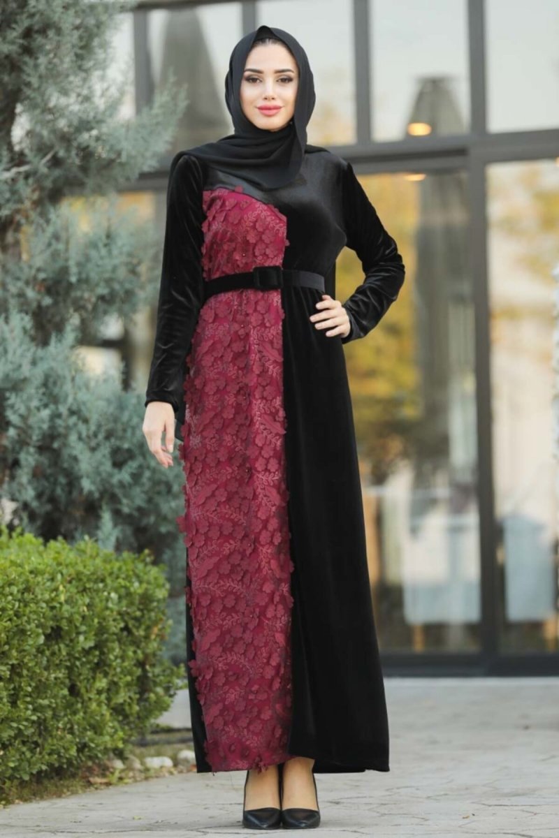 Neva Style Çiçek Detaylı Bordo Kadife Elbise