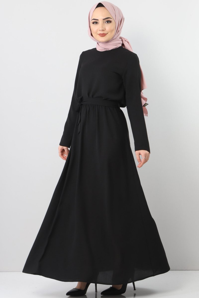 Tesettür Dünyası Siyah Beli Lastikli Ayrobin Elbise