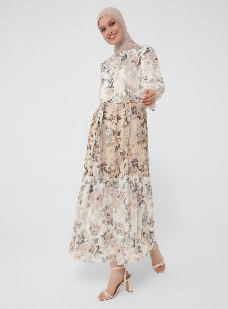 Refka Natural Çiçek Desenli Desen Bloklu Şifon Rahat Kesim Elbise