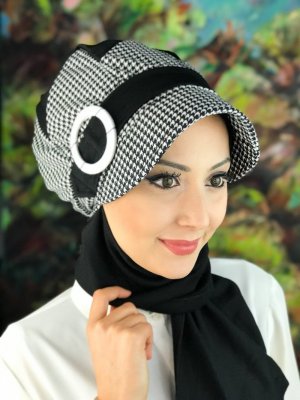 BUTİK AMBAR Siyah Desenli Atkılı Tokalı Şapka