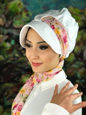 BUTİK AMBAR Beyaz Desenli Fularlı Tek Biritli Şapka