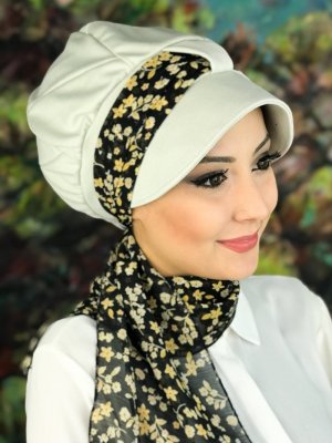 BUTİK AMBAR Bej Desenli Fularlı Tek Biritli Şapka