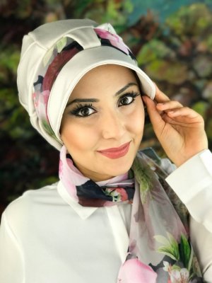BUTİK AMBAR Bej Desenli Fularlı Tek Biritli Şapka
