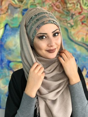 BUTİK AMBAR Gri Bej Yeşil Şerit Detaylı Drapeli Hazır Şal