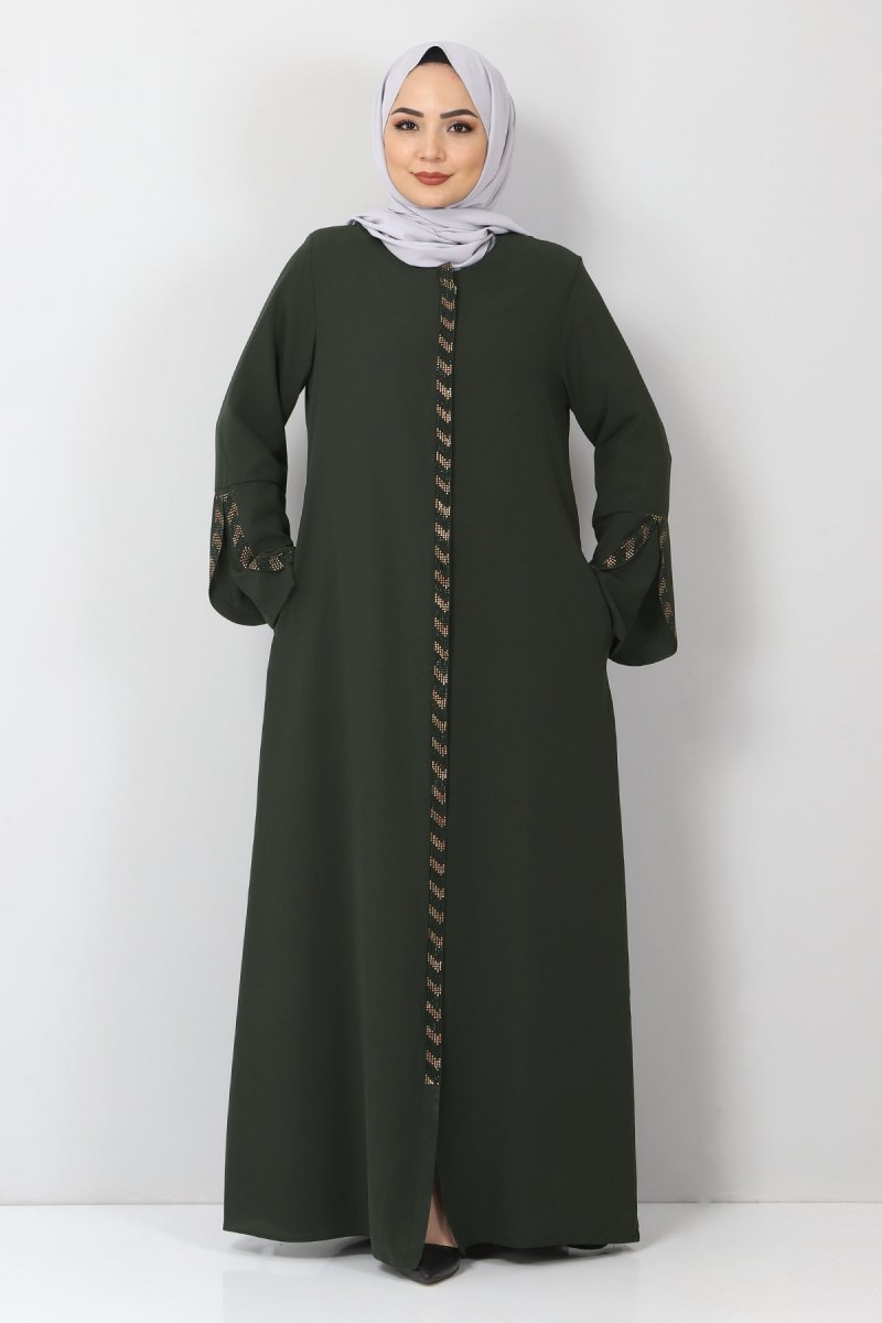Tesettür Dünyası Haki Büyük Beden Taş Detaylı Ferace